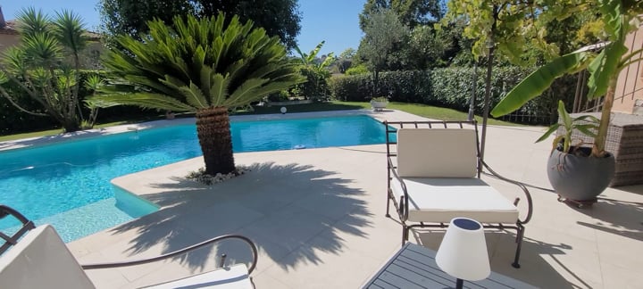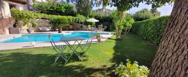 La piscine (9 x 4 m) est aménagée avec une grande pergola & un camphrier de haute-tige donnant de l'ombre