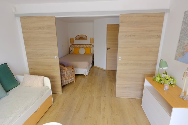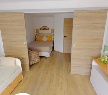 Une chambre familiale (**) avec 2 espaces de vie distincts et indépendants (premier espace de 11 m2 avec lit double 140 x200, deuxième espace de 11 m2 avec et 2 lits gigognes de 80x200)