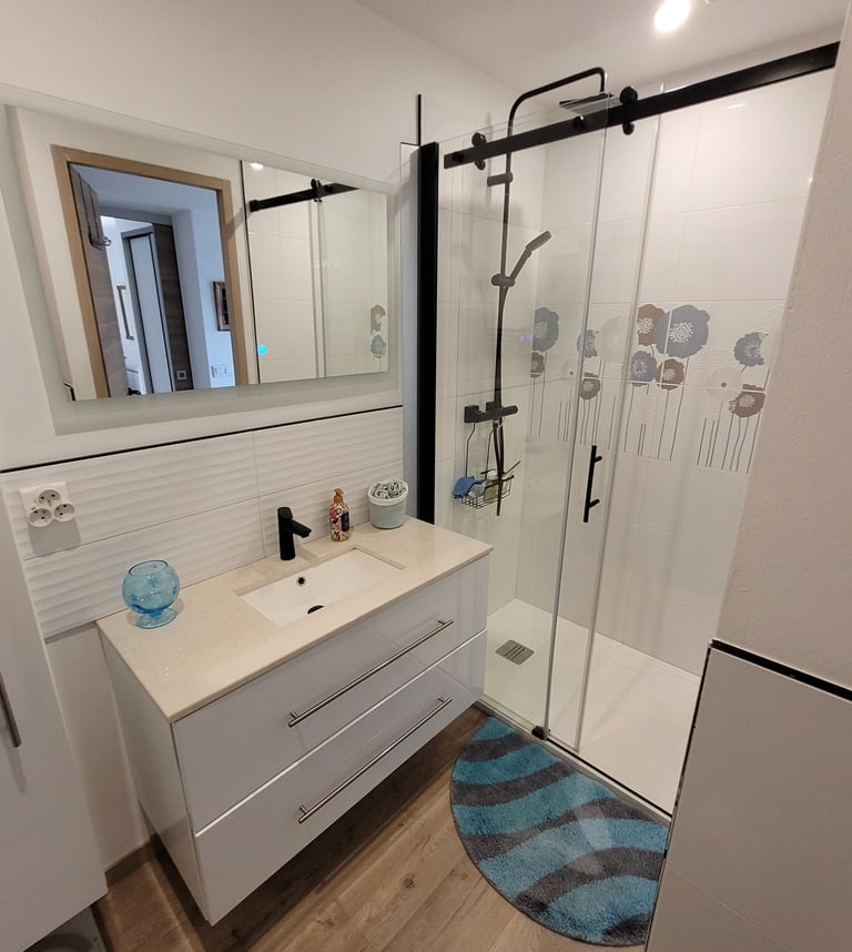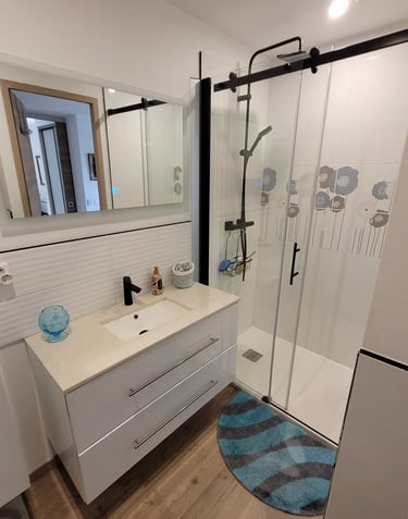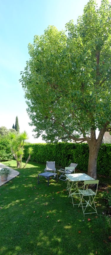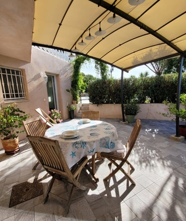 Devant l'appartement, un espace privatif avec une grande pergola pour vous protéger du soleil afin de savourer vos petits-déjeuners, déjeuners et diners et de garer de façon sécure et privative, votre voiture.